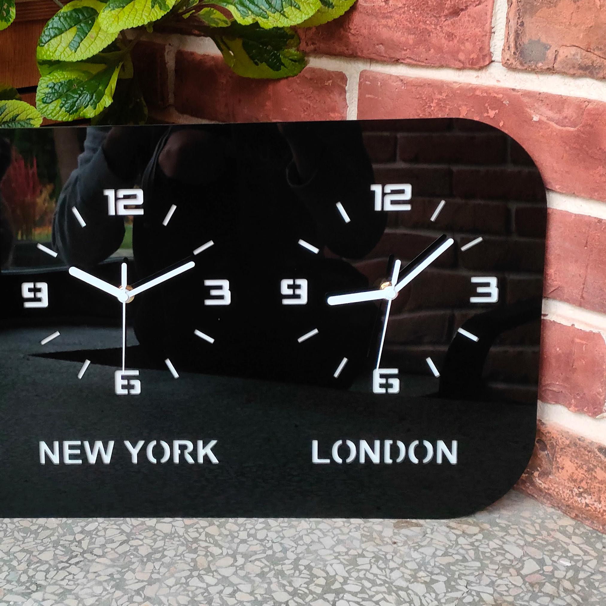 Each clock face is elegantly engraved and set against a **high-gloss black acrylic panel** that beautifully reflects light and surroundings, adding a luxurious touch to any space.