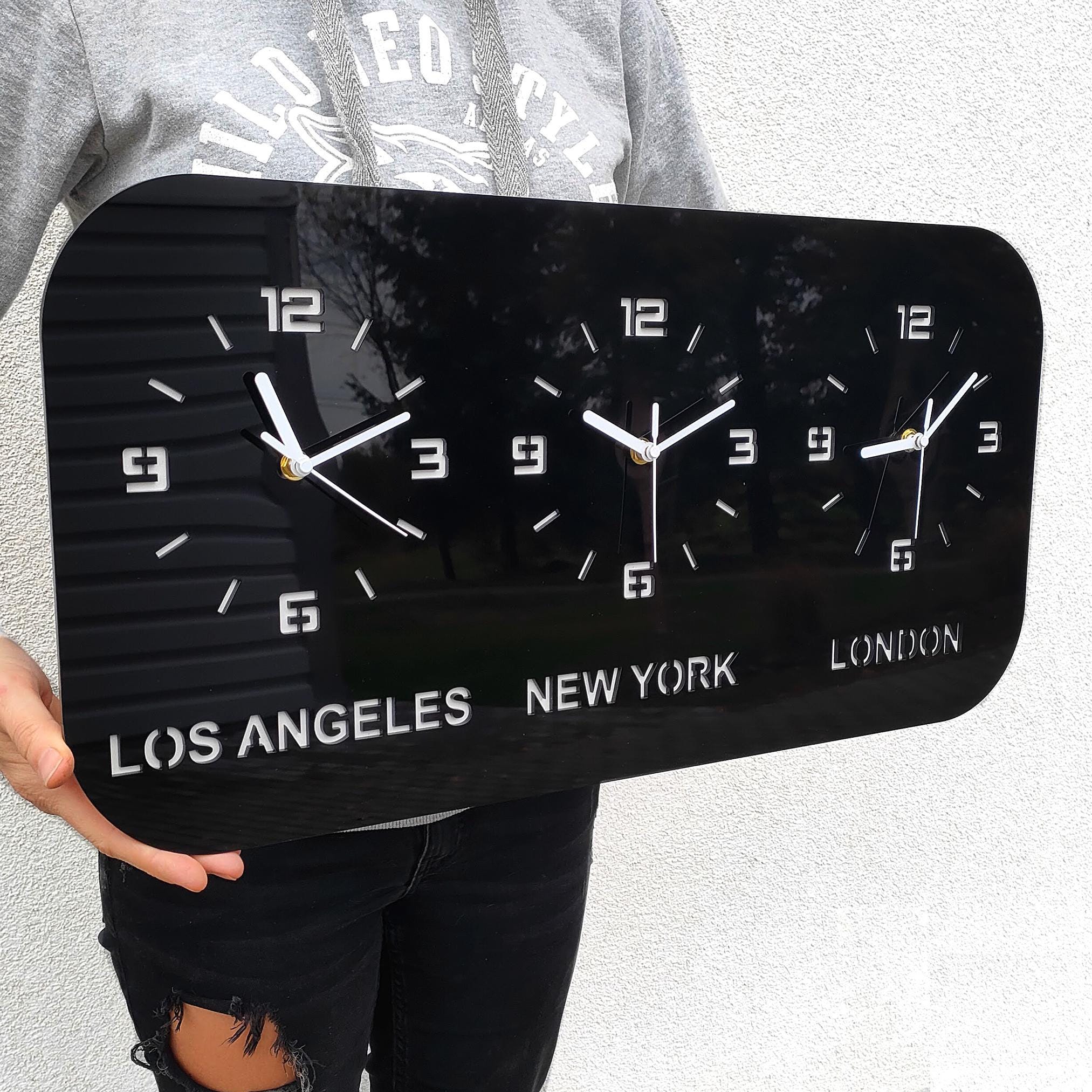 world clock, time zone clock, personalized clock, modern wall clock, glossy black clock, office decor, travel gift, multiple time zones, custom city clock, wall decor, home office clock, elegant design, business gift, black acrylic clock, modern home accessory, contemporary wall art, los angeles new york london clock, minimalist clock, silent wall clock