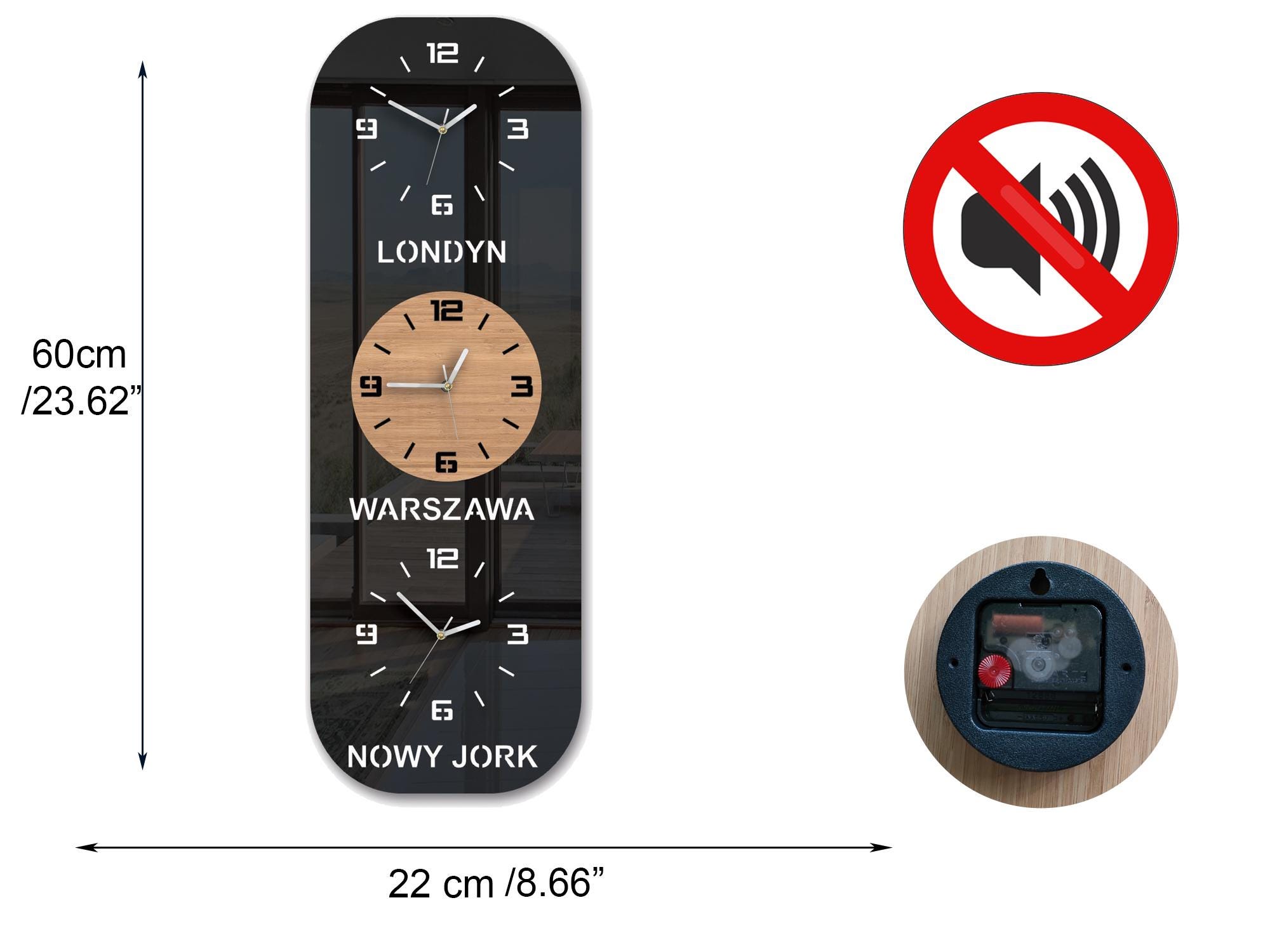 This elegant 3-zone wall clock displays the current time in **London, Warsaw, and New York**, but you can fully **customize the city names and time zones** to suit your lifestyle, family, or business needs.
